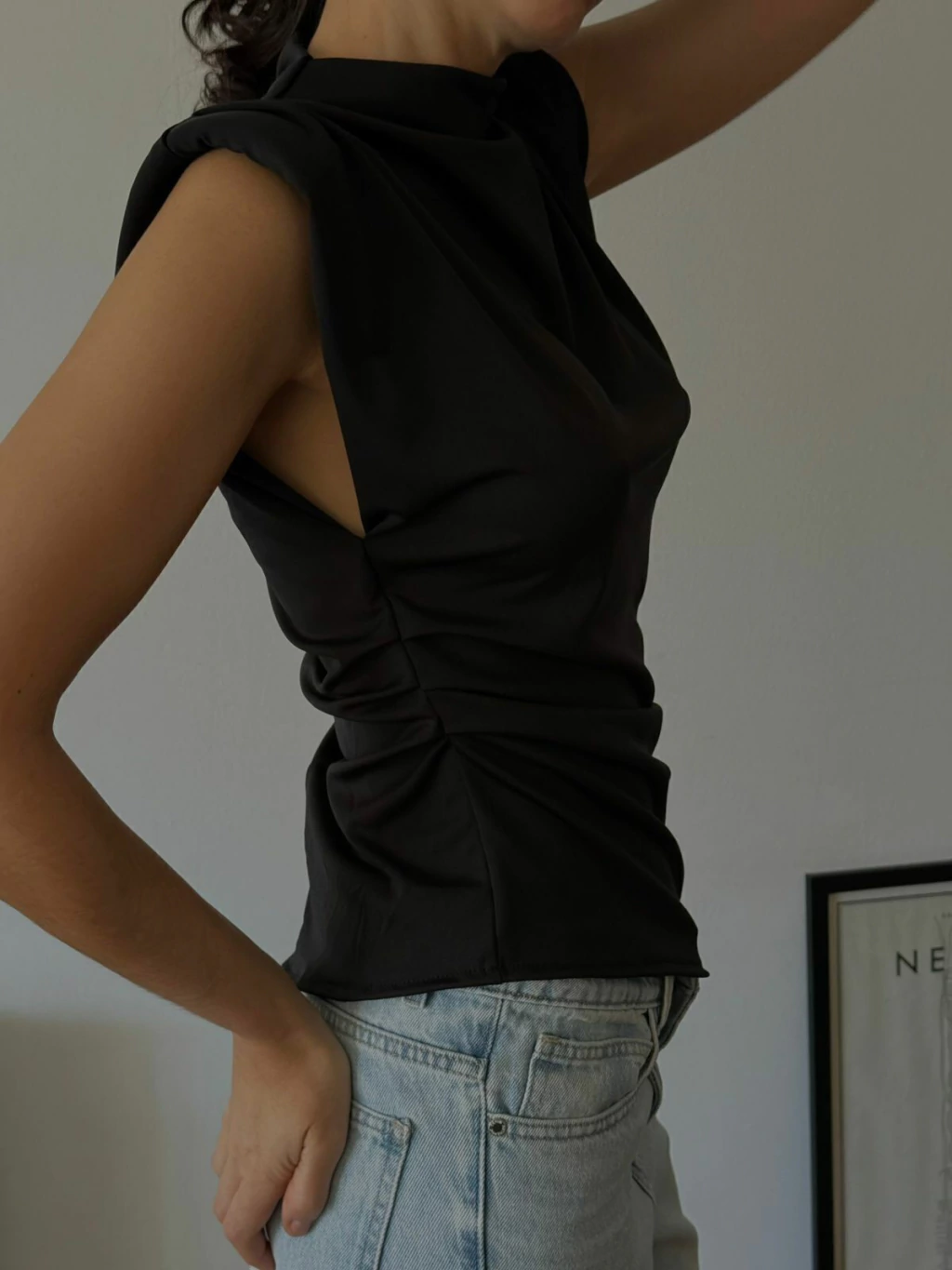 Top confeccionado en lycra suave y con leve elasticidad, ideal para un calce cómodo y moderno. Presenta hombreras que estructuran la silueta y detalles de tablitas en los hombros y en el lateral, aportando un toque sofisticado. El delantero tiene una asimetría en el ruedo, que lo hace distinto y vanguardista.